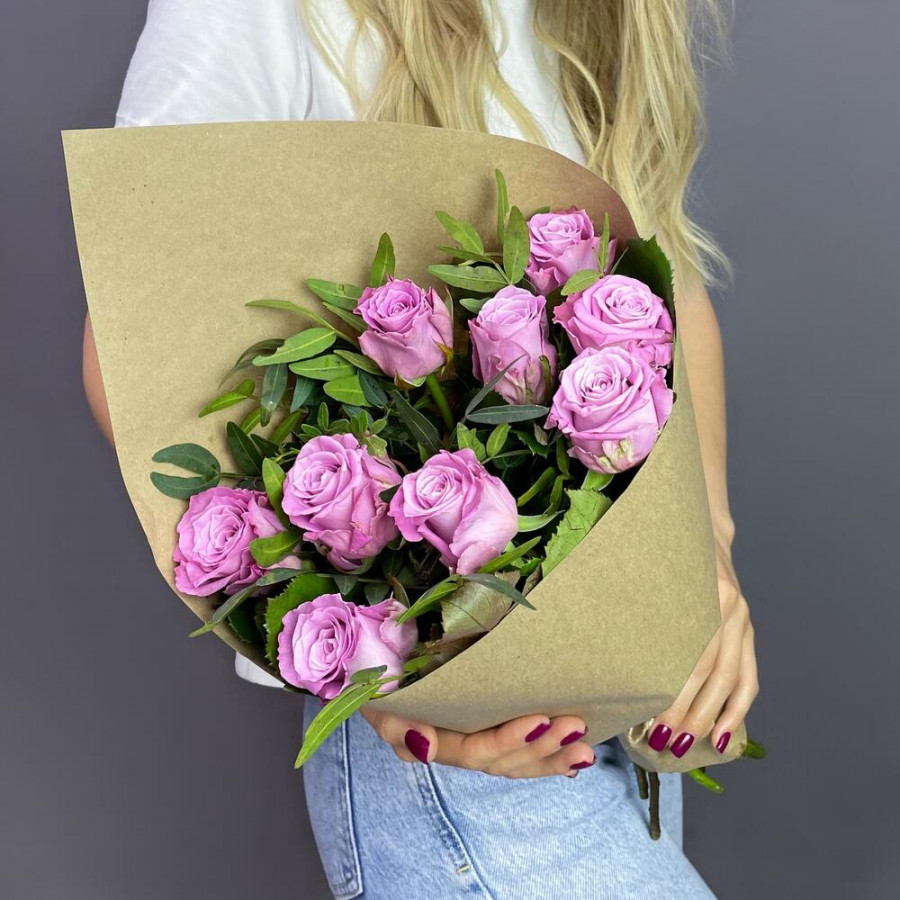 На фото букет из 9 сиреневых роз. В составе: роза 9 шт, писташ 3 шт, крафт-бумага 1 шт, атласная лента 1 шт, . Все цветы свежие и ароматные, букет красиво оформлен и отлично подходит для подарка. Доступна доставка цветов или самовывоз.